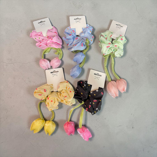 Cherry Blossom Scrunchie with Tulip Tassels – Cute Floral Hair Tie