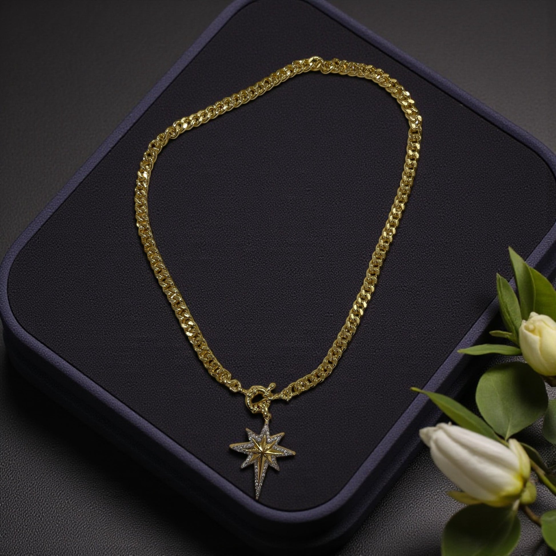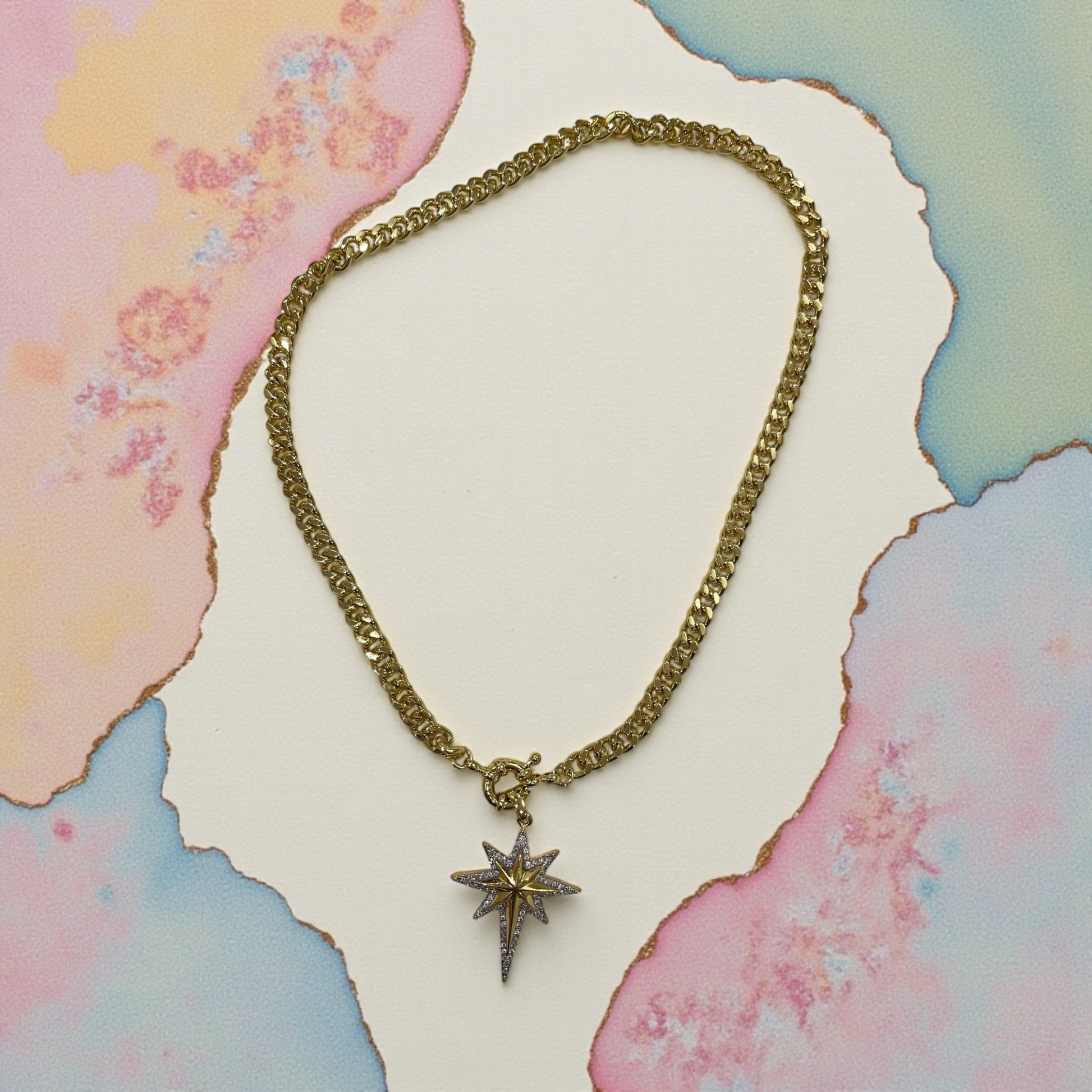 An elegant gold-tone necklace featuring a bold Cuban link chain and a stunning star-shaped pendant. The pendant is designed with a radiant multi-point star, highlighted by a polished gold center and sparkling crystal accents along the edges, adding a luxurious shine.