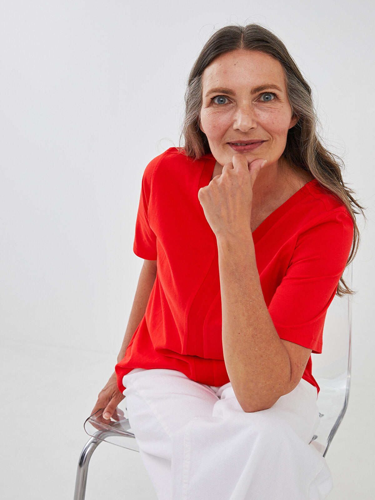 LCW V-Neck Straight Short Sleeve Blouse- Large