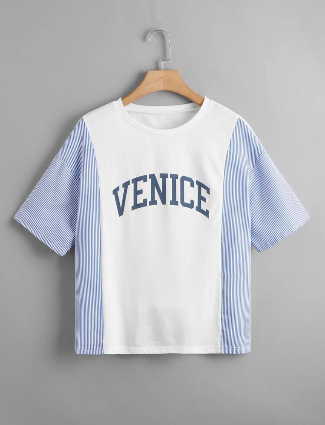 Shein Plus Letter And Striped Print Drop Shoulder Summer Tee - 0XL,1XL