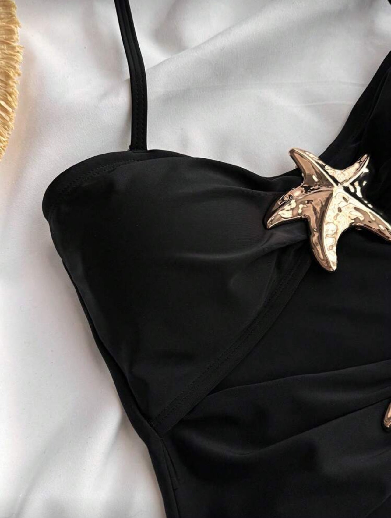 SHEIN Teen Girls Black 1pc Detachable Strap Hollow Starfish Accent Ruched One-Piece Swimsuit Summer,Beach - 15Years
