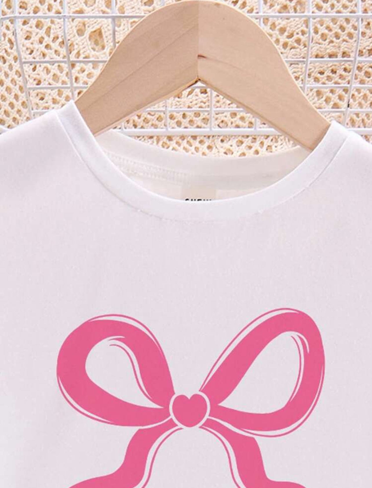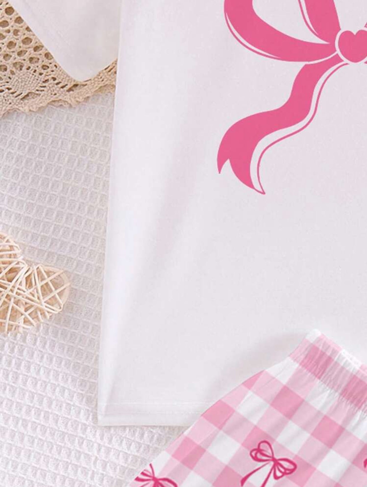 SHEIN Tween Girls' Casual Bow Decor Round Neck Short Sleeve T-Shirt And Plaid Shorts Pajama Set, Suitable For Summer Home Refresh - 10Years