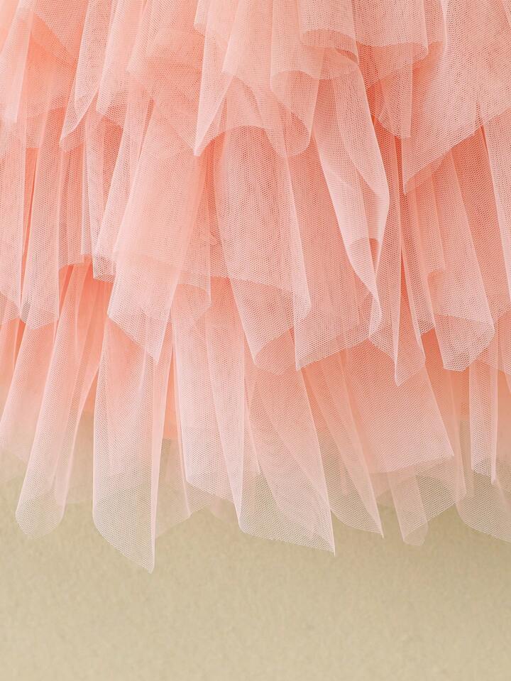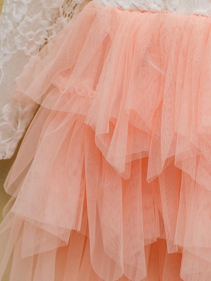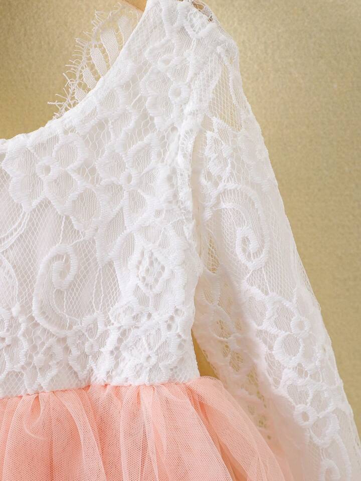 SHEIN Young Girl Contrast Color Round Neck Long Sleeve Mesh Summer Dress - 4Y